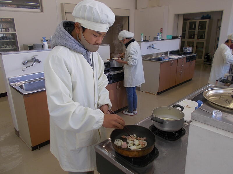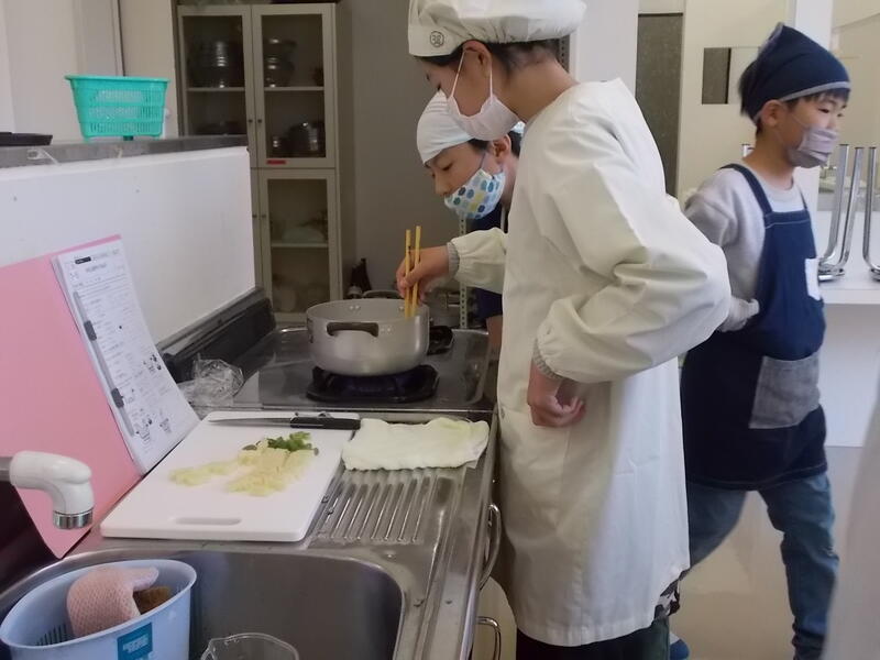 6年生は朝食のおかず、5年生は味噌汁づくりをしました。感染状況が落ち着いているとはいえ、感染防止の観点から一人一人、自分の分だけを調理しました。