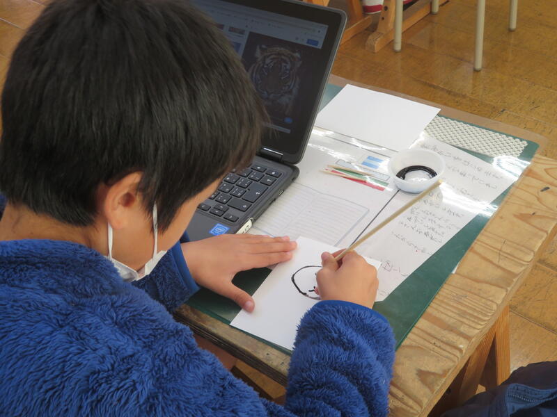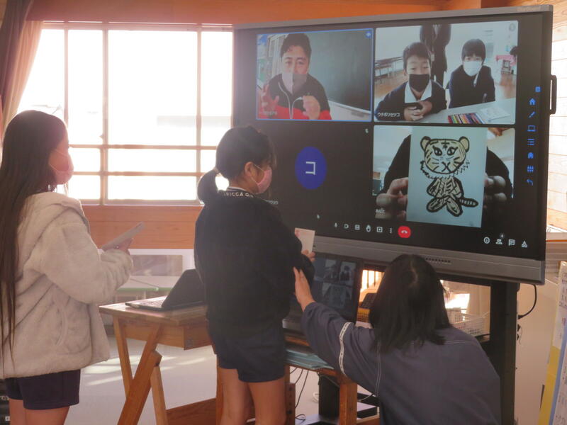 3,4年生は、鹿児島の伊唐小学校とオンラインでつないで、図工の授業を行いました。