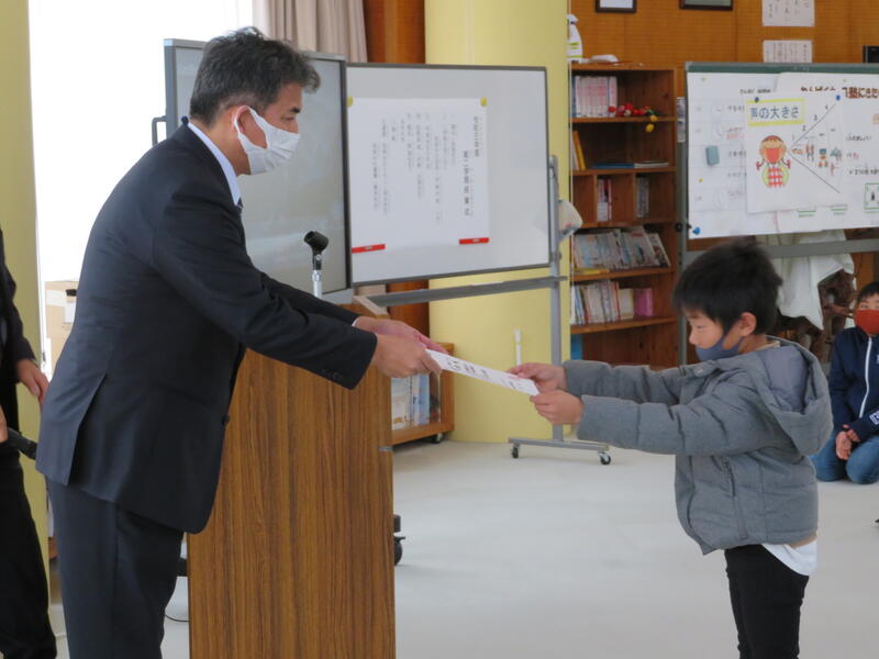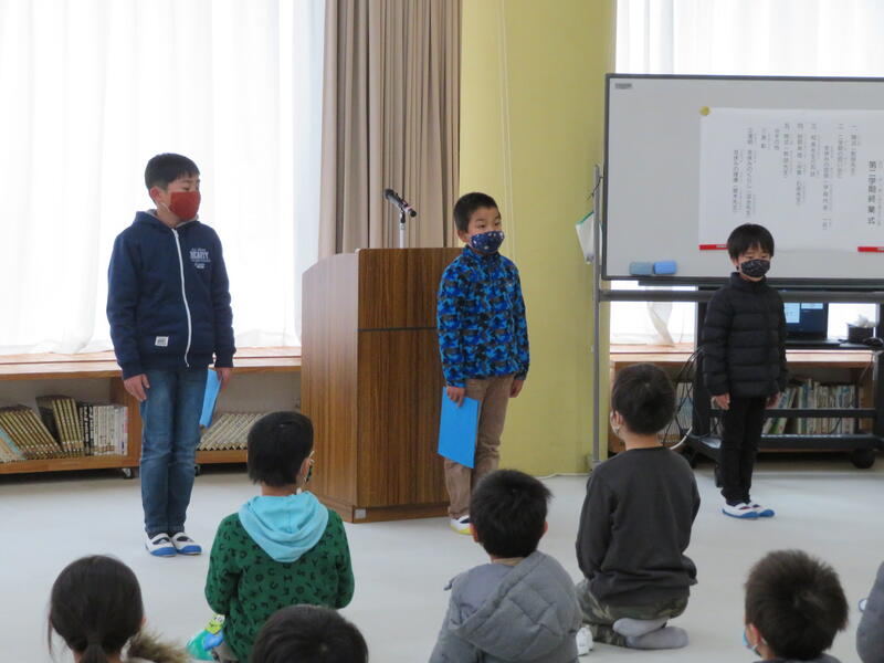 学級の代表が2学期のふり返りと3学期に向けての抱負を発表し、校長先生のお話と、表彰がありました。