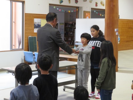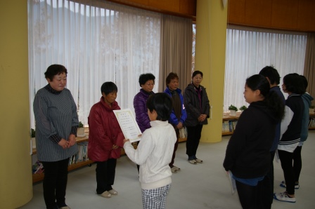 毎朝、登校見守りをしていただいているみなさんを招き、感謝の気持ちを伝える会を行いました。子どもたちから、感謝の気持ちを添えて、お一人お一人に感謝状をお渡ししました。