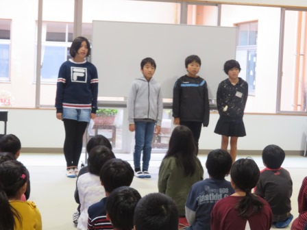 保健委員の児童が、かぜやインフルエンザをよぼうするために大切なことをクイズにして出題しました。クイズの解答に一喜一憂しながら、かぜ予防を楽しく学ぶことができました。学んだ後は、音楽のリズムに合わせて、手洗いの練習をしました。また、持久走大会の表彰も行いました。
