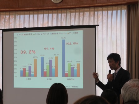 子どもたちが毎日を安心、安全に過ごすことができることを願い、「情報安全出前講座」を行いました。球磨教育事務所から、別府一英社会教育主事を講師に招き、保護者と教職員が情報安全について学びました。