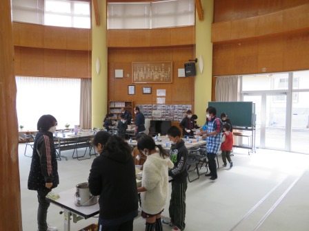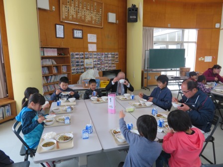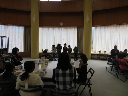 今日は、毎月一回の「なかよし給食」の日でした。地域交流センターに全員が集まり、楽しく会食しました。冨永先生から大根の花や栄養についての話も聞きました。