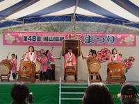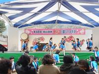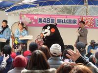 ダム湖畔の桜のつぼみが膨らみ、ほころび始めました。17日(日)には、第48回湯山温泉桜まつりに、3~6年児童が出演しました。桜姫太鼓(本校児童も参加)のオープニングに始まり、祝いもち投げとセレモニーが続きました。もち投げには、くまモンも登場しました。その後、「よさこいソーラン」「KUMAKOI六調子」をたくさんの来場者を前に披露しましました。