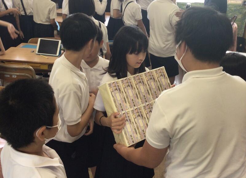 山鹿市法人会から9名の方をお迎えして、租税教室がありました。なぜ税が必要なのか、どんな税があるのか等たくさんの学びがありました。班ごとにゲーム形式で活動をしたり、1億円の札束の見本を持ってみたりと、楽しみながら税が私たちの生活にどのように役立てられているか学習することができました。