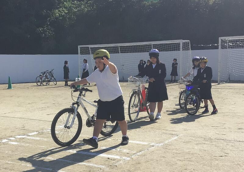 自転車教室では、左右確認や横断歩道は自転車をおして渡ること等を実際に行いながら、安全な乗り方を確認しました。「ヘルメットのあごひもをしっかりしめること」「ジュースを飲みながら等のながら運転をしないこと」「一列で走行すること」等を合わせて確認しました。横断歩道の安全な渡り方についても改めて確認しました。