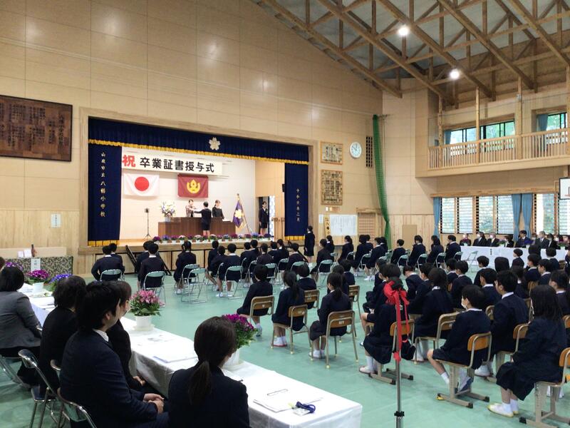 八幡小での6年間の教育課程を終え、その歩みをたしかめるように、ゆっくり、堂々と前に進み、壇上で卒業証書を立派に受け取る卒業生の姿がありました。