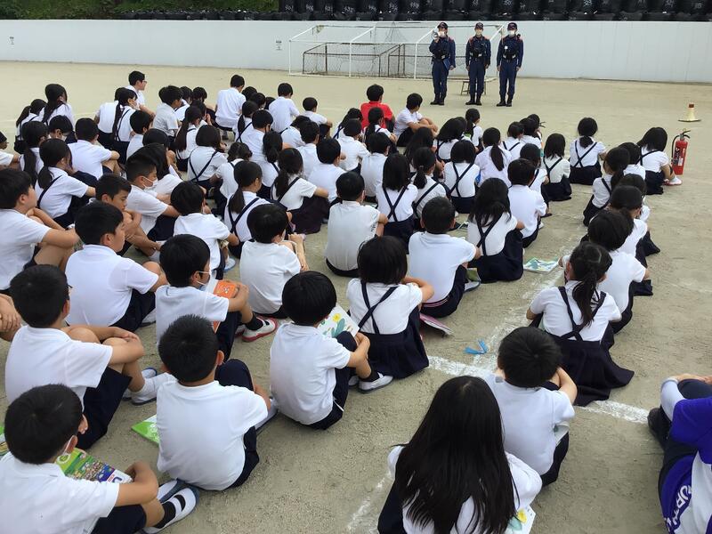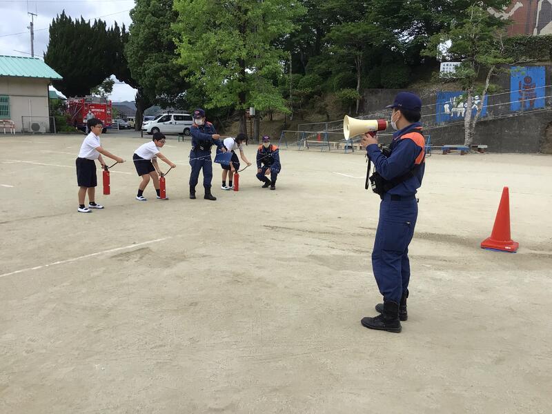 今回は消防署から3人の方に来ていただき、避難の様子を点検・評価していただきました。落ち着いて真剣に行動することができていたことから、「みなさんの避難の様子はとても良かったです」と言っていただきました。また、消防署の方から消火器の正しい使い方や家庭で避難する際にはブレーカーを切ることなどについても教えていただきました。全校児童を前に、6年生の代表者が水消火器を使って正しい使い方を披露しました。