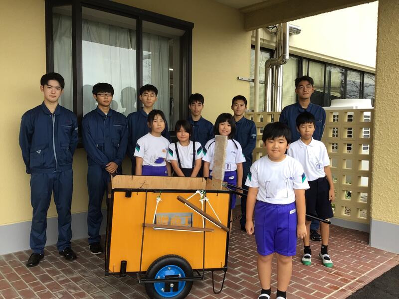 生徒のみなさんからは、リヤカーの使い方について、わかりやすく教えていただきました。小学校からは、代表して環境委員会の児童が受け取り、御礼の言葉を伝えました。
